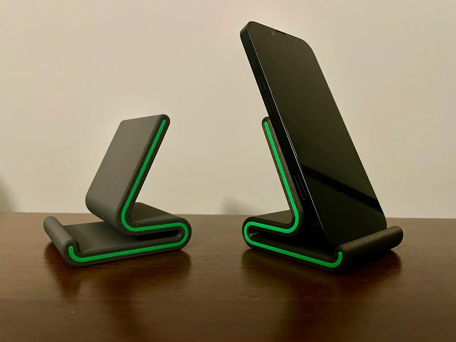 The stand is designed to hold the phone with or without a case. Accents on the side are printed separately and fitted in after being printed
